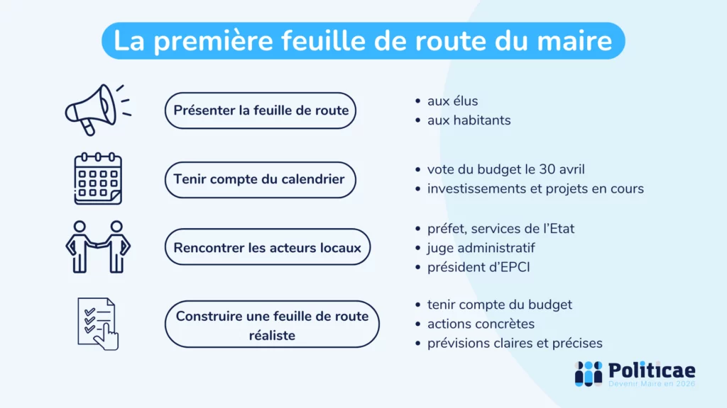Outre les obligations calendaires et politiques, la première feuille de route du maire doit contenir des objectifs clairs, chiffrés et datés. Elle transcrit les grandes lignes du programme électoral en actions concrètes et dont les résultats seront visibles à court ou moyen terme. Par exemple, lancer aussitôt la procédure de création d’une brigade canine, ou engager les travaux pour l’ouverture de la maison de santé promise. Cela permet au maire de montrer aux habitants que le programme porté pendant la campagne n’est pas simplement une liste de promesses sans effet. La clarté et le réalisme de cette feuille de route garantissent la crédibilité de l’équipe municipale et suscitent la confiance des habitants.