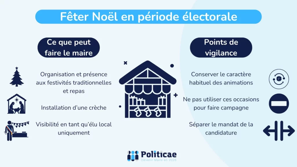 Chaque année, les préparatifs et festivités de Noël occupent une place importante dans les communes. Entre l’installation des décorations, le marché de Noël, les multiples occasions de partager un verre de l’amitié ou un repas festif, quelle est la place du maire sortant? En période de campagne, doit-il éviter de se montrer, ou bien profiter de ces moments pour promouvoir sa candidature? Dans cet article, voyons quelques points de vigilance à garder en tête pour fêter Noël en période électorale en toute légalité.