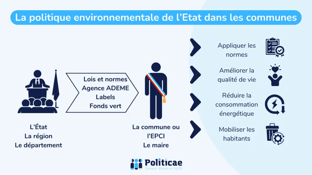 Tout d’abord, l’État a mis en place un certain nombre de structures pour aider les communes à s’engager dans la transition écologique. La plus importante est l’agence ADEME (Agence de l’environnement et de la maîtrise de l’énergie). Elle conseille les collectivités, étudie les candidatures pour des labels, et surveille l’application de la législation environnementale. Elle fournit ainsi aux collectivités à la fois des aides financières et des conseils en ingénierie. Il s’agit en tout cas de l’organe principal de mise en place de la politique environnementale de l’état dans les communes
