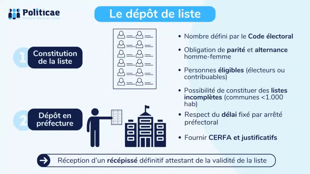 Le dépôt officiel de la liste constitue l’étape la plus délicate du processus électoral. Chaque candidat tête de liste doit déposer un dossier complet en préfecture ou en sous-préfecture avant la date limite fixée par un arrêté préfectoral. Ce délai est impératif : tout retard rend automatiquement la candidature irrecevable.