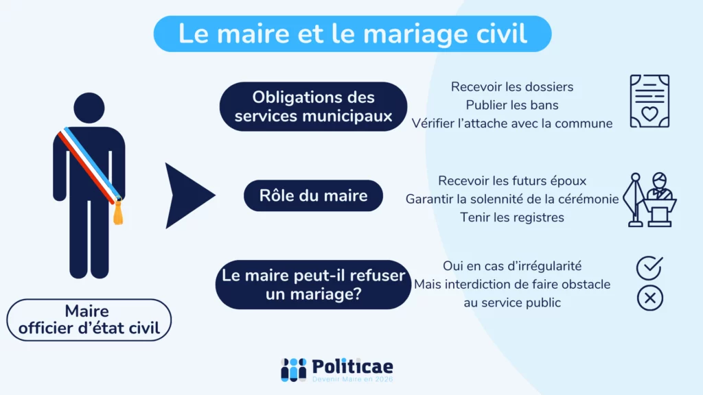 En tant qu’officier d’état civil principal de sa commune, le maire s’assure du bon déroulement de cette obligation réglementaire. S’il s’aperçoit que l’un des conjoints ne remplit pas l’une des conditions légales pour contracter mariage, il peut refuser de le célébrer.