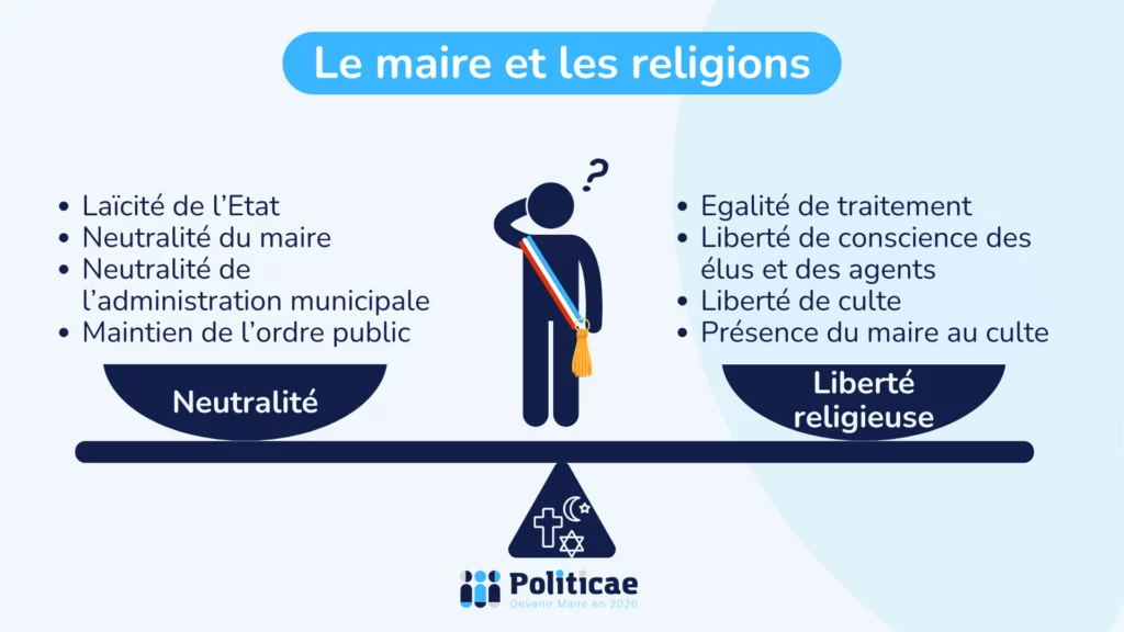 La Constitution française promeut à la fois la laïcité et la liberté religieuse. Comment concilier ces deux principes? Tout candidat à l’élection municipale peut afficher ses convictions, ce qui relève de sa liberté religieuse. Il n’est pas soumis à l’obligation de neutralité. En revanche un maire, lorsqu’il agit en tant que représentant de l’État, doit garder, vis-à-vis des religions, une attitude de stricte neutralité. Ce principe ne l’empêche pas de conserver sa liberté religieuse.