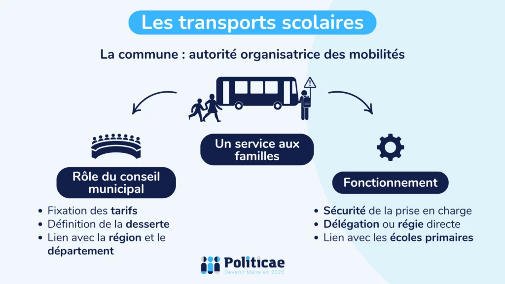 • Si les transports scolaires sont gérés à l’échelle intercommunale, il fait entendre la voix des parents pour améliorer l’offre de transport. Il peut aussi éviter une modification de la desserte qui pénaliserait les enfants de sa commune. Par exemple la modification d’une ligne, la suppression d’un arrêt.