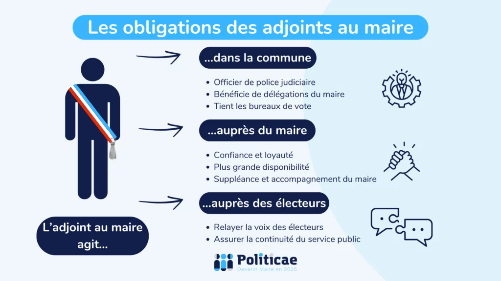 De même que le maire, les adjoints sont officiers de police judiciaire et d’état civil. Ils remplissent donc les fonctions liées à ce statut. Cela signifie d’une part qu’ils portent l’écharpe tricolore à franges d’argent lorsqu’ils agissent en cette qualité ou qu’ils remplacent le maire. D’autre part, les obligations légales des adjoints sont liées à celles du maire. Elles dépendent des pouvoirs que le conseil municipal délègue au maire. Ce dernier donne à son tour aux adjoints une délégation de fonction ou de signature, selon les besoins locaux et à sa guise. En tant qu’élus, les adjoints ont les mêmes obligations que les autres conseillers municipaux. Cela concerne la représentation des électeurs, le conseil du maire, et surtout la tenue des bureaux de vote, qui est le seul impératif fixé par la loi.