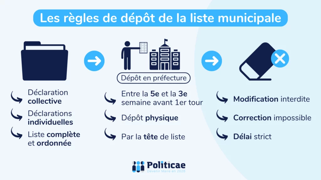 Le dépôt des listes de candidats s’effectue dans une période précise, fixée par décret en amont de chaque élection municipale. En général, les candidats disposent d’environ deux semaines pour déposer leur dossier de candidature, entre la cinquième et la troisième semaine précédant le premier tour. Ce calendrier, impératif, est communiqué officiellement par un arrêté préfectoral. Toutefois, aux termes de l’article L.267 du code électoral, ce dépôt ne peut intervenir après le troisième jeudi précédant le premier tour des élections à dix-huit heures. Dans le cas d’un premier tour le 15 mars, cette limite interviendra donc le jeudi 26 février.