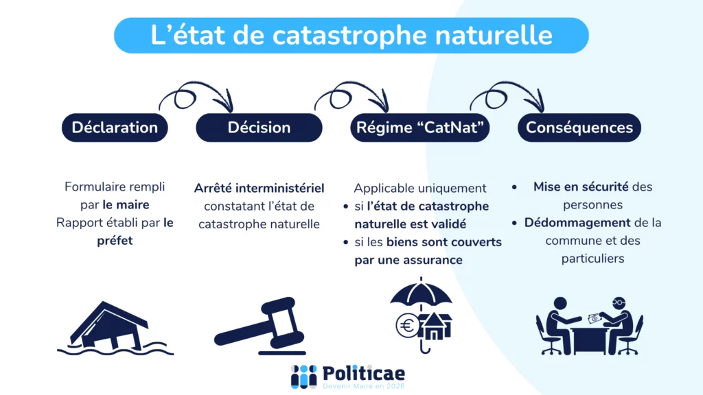 Lorsque sa commune est victime d’un sinistre naturel causant d’importants dégâts, le maire adresse au préfet une demande de reconnaissance de l’état de catastrophe naturelle (formulaire Cerfa n°13669*01). Il identifie précisément le lieu, la date, le type du phénomène. Il indique également le nombre de bâtiments touchés et les mesures préventives existantes, comme le Plan de Prévention des Risques. Le préfet établit un rapport, qu’il transmet ensuite au Ministère de l’Intérieur. Une commission interministérielle prend alors un arrêté et le publie au Journal officiel. Enfin, la préfecture le communique aux communes concernées.