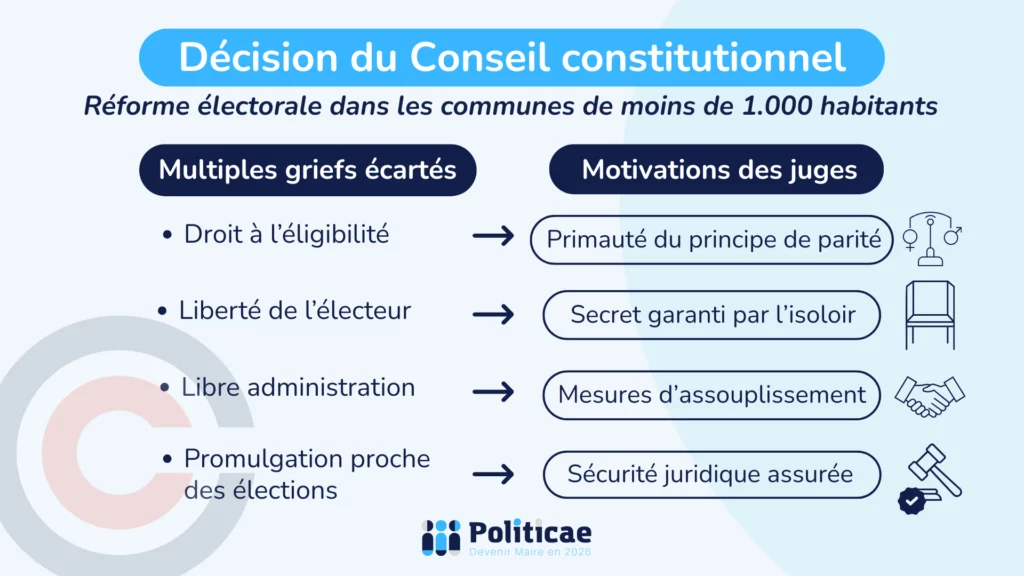 Plusieurs parlementaires, députés comme sénateurs, avaient saisi le Conseil constitutionnel, arguant que cette réforme porterait atteinte à des principes fondamentaux . La saisine s’appuyait en effet sur le droit d’éligibilité, la liberté de l’électeur, le secret du vote, le pluralisme politique. Elle invoquait même le principe de la libre administration des collectivités territoriales. Le Conseil constitutionnel a rejeté ces griefs un à un.