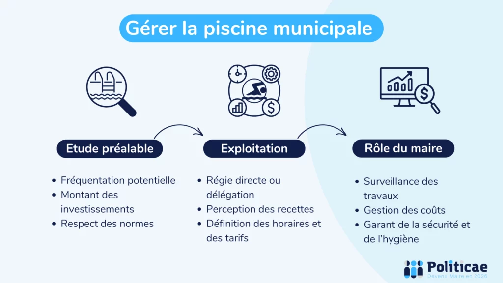Quant au maire, son rôle est particulièrement important dans l’utilisation de la piscine municipale. Il peut communiquer auprès des habitants pour souligner l’accomplissement des travaux au cours de son mandat, valoriser les activités proposées. Il a également le pouvoir d’interdire le port de certains vêtements, la consommation d’alcool dans les espaces annexes, voire d’ordonner la fermeture de l’établissement en cas de risque sanitaire.