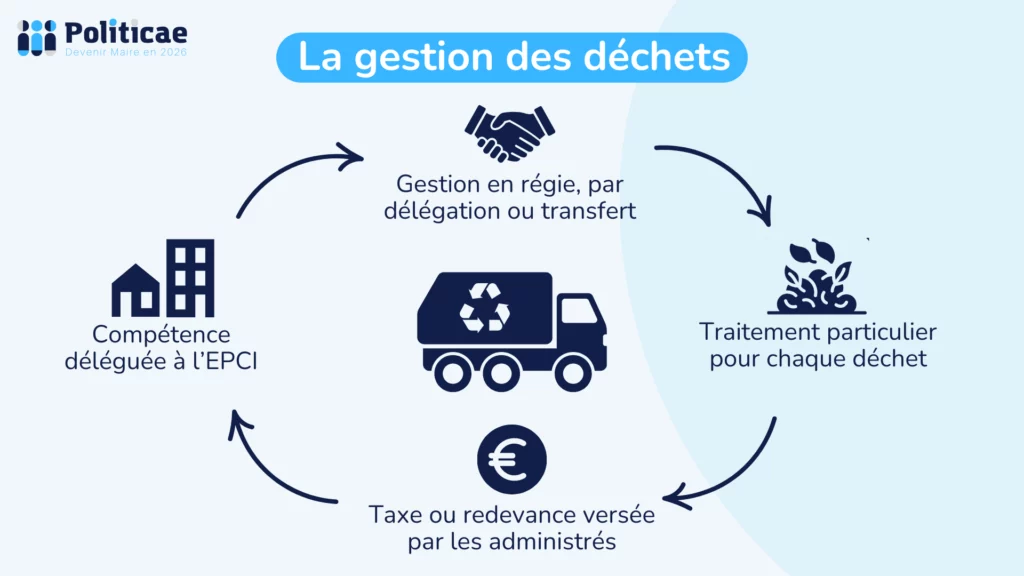 Les articles L2224-13 et suivant du CGCT déterminent la répartition des compétences en matière de déchets. La gestion des déchets revient aux communes mais celle-ci la transfère généralement à l’intercommunalité (communautés de communes, d’agglomération ou urbaines). L’EPCI organise alors la collecte et le traitement des déchets selon l’une de ces trois catégories :